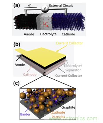 鋰離子電池的結構示意圖,其中Li+(鋰離子)在內電路中,通過電解質傳導