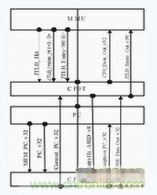 協(xié)助TLB進行虛實地址轉(zhuǎn)換是CP0的主要功能之一。TLB屬于系統(tǒng)的特權(quán)資源,只有CP0有權(quán)對其進行訪問,因此CP0與TLB之間的連線較多,數(shù)據(jù)交換的時延也比較關(guān)鍵。同時,PC模塊與CP0的數(shù)據(jù)交換也非常重要。因此,CP0單元在版圖上最好同時靠近TLB和PC模塊。本設(shè)計將CP0中與TLB相關(guān)的邏輯與寄存器獨立為CP0T,放在MMU與PC模塊之間;CP0的其余部分歸為CP0E,放在PC下部,也就是整塊芯片的最下端。如下圖所示。