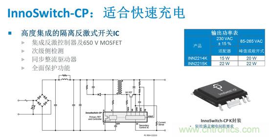 “目前PI提供兩種型號(hào)的InnoSwitch-CP器件。INN2214K IC提供15W輸出功率,適用于通用輸入電壓范圍的充電器和適配器應(yīng)用,而更大型號(hào)的INN2215K在同類應(yīng)用中可提供最大22 W的輸出功率。” Jason介紹說(shuō)。