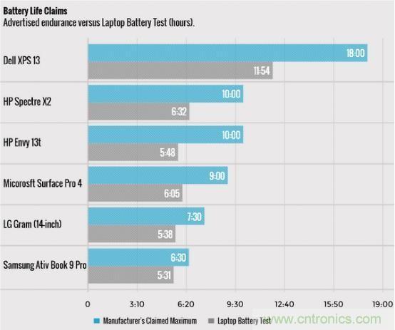 通過上圖可以看到,其中差異最大的戴爾XPS 13,宣稱電池壽命與實際相差近6小時,令人咋舌。差異最小的機型為三星Ativ Book 9 Pro,為30分鐘,但其本身電池壽命就不長。而其他機型的差異,普遍在3小時以上。需要指出的是,電池測試并不能完全代表現(xiàn)實環(huán)境。比如,測試時的屏幕亮度約為100尼特,但實際使用中我們基本上都會把亮度調(diào)至更高;另外測試軟件模擬的計算機應用形式實際上比較單一,比如連續(xù)視頻播放、觀看網(wǎng)頁等等,但你在現(xiàn)實中往往會進行更復雜的多任務(wù)。也就是說,你可能會發(fā)現(xiàn)筆記本電腦續(xù)航時間比媒體測試的時間更短。