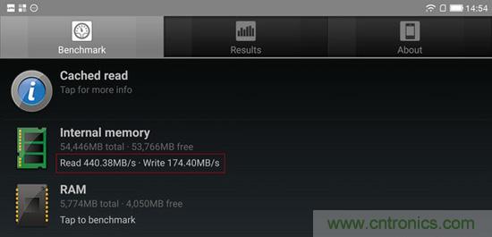 同時,我們又測試了另一款UFS 2.0閃存智能手機——樂Max 2。它的讀取速度為440.38MB/s,寫入速度則為174.40MB/s,相比小米5的讀寫速度更快一些。由此不難看出,盡管都采用UFS 2.0閃存,但是終端產品不同,其讀寫速度依然會存在一定差異。