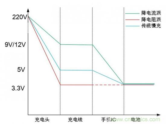 從電壓的角度來對(duì)比一下傳統(tǒng)慢充、降電阻快充技術(shù)與降電流快充技術(shù),如下圖所示。