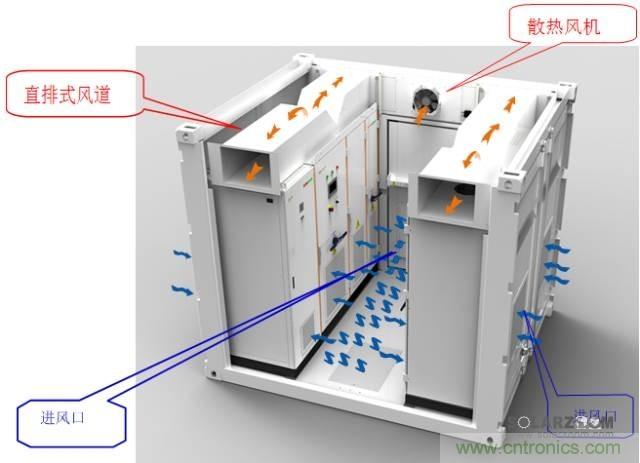 陽(yáng)光電源箱式逆變房將逆變器、直流柜、通訊單元集成于一體,采用簡(jiǎn)潔的分段直排式風(fēng)道,風(fēng)道內(nèi)不含風(fēng)機(jī),零損耗,免維護(hù)。風(fēng)道長(zhǎng)度僅1m,壓力損失小,風(fēng)機(jī)處于最佳效率狀態(tài)。逆變器在工作時(shí),大部分熱量通過(guò)風(fēng)道排出集裝箱外,僅有少量熱量通過(guò)輻射傳到箱體內(nèi)部,內(nèi)部空氣吸收熱量后向頂部流動(dòng),再由集裝箱頂部排風(fēng)扇排出,確保了逆變器的長(zhǎng)期可靠運(yùn)行。