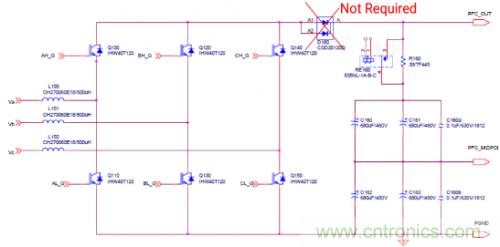 在六管組成三相VIENNA拓撲的PFC,采用全6管SiC的MOSFET,可以省掉快恢復二極管,如下圖3所示: