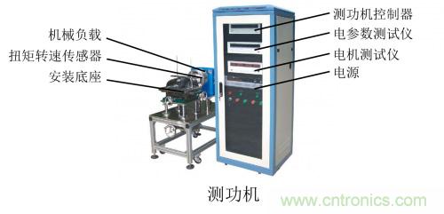 測功機的構造很簡單,由一個機柜和測試臺架組成,其中測試臺架又常稱作測功頭,一般是指扭矩轉速傳感器和制動器做成一體的款式。測試臺架包括安裝底座、扭矩轉速傳感器、機械負載(制動器),用于電機試驗時的力矩加載,模擬電機的不同工況;機柜包括電參數測試儀、電機測試儀、測功機控制器、電源等,用于對系統的驅動和對電機的測試。