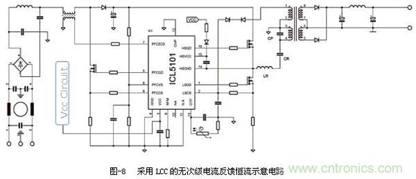 圖-8是省略次級電流采樣反饋的示意電路,工作在固定頻率,整體電路更加精簡,整機成本可以與"PFC+反激"拓撲競爭??紤]到效率等因素,整體成本甚至更低。