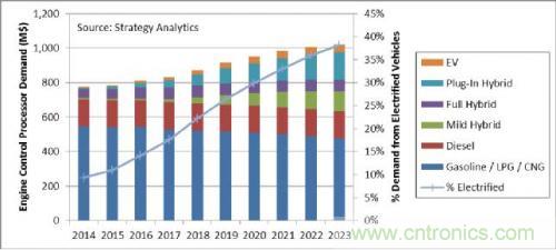 在這些發動機控制應用程序當中,來自電動汽車動力系統的處理器需求增速遠遠高于傳統汽油和柴油動力汽車。如上圖所示,到 2023 年,超過 37% 的發動機控制處理器需求將來自電動汽車。這個比例明顯高于電動汽車 15% 的產量份額,因為不少電動汽車都是混合動力汽車,同時需要對汽油/柴油發動機和電動機/變頻器/電池進行控制。