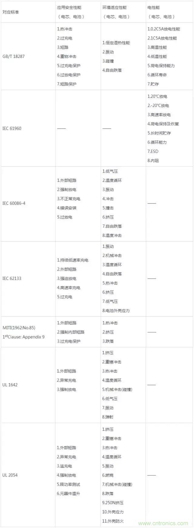 今天編輯將這些主要鋰電池標準分別從不同的角度考察了鋰電池的安全性和電性能,現(xiàn)將分類如下。從表上可以看出,目前鋰電池各種標準主要從三個角度考察鋰電池的安全及電性能: