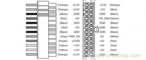 主板上的24pin供電接口就用到了PC電源上全部5種供電電壓,即+12V、+3.3V、+5V、-12V以及+5VSB,另外還有一個(gè)-5V,不過這個(gè)電壓對(duì)應(yīng)的硬件和接口實(shí)際上早已淘汰,因此現(xiàn)在的PC電源已經(jīng)不再提供-5V供電,在24pin接口中的這一路僅是名義上的存在。