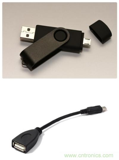 USB On-the-Go(OTG)是使設(shè)備能夠充當(dāng)主設(shè)備或從設(shè)備的規(guī)范。USB OTG可廣泛應(yīng)用于PC、智能手機(jī)、ePOS(電子銷售點(diǎn))和移動(dòng)電源。主設(shè)備或從設(shè)備的角色可以根據(jù)協(xié)議進(jìn)行改變。數(shù)據(jù)可從智能手機(jī)或相機(jī)傳輸存儲(chǔ)到U盤中,當(dāng)智能手機(jī)連接到主設(shè)備PC時(shí),智能手機(jī)也可以充當(dāng)從設(shè)備。數(shù)碼相機(jī)照片可直接上傳至打印機(jī),而無需通過PC傳輸。數(shù)據(jù)可在“從設(shè)備”之間相互傳輸。這在我們的日常生活中十分有用。圖1所示為市售的USB OTG驅(qū)動(dòng)器和USB OTG連接線。