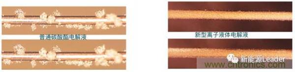 日本三重大學(xué)的Hui Wang等「3」開(kāi)發(fā)了低濃度離子液體電解液,主要由溶解四甘醇二甲醚(G4或者G10H22O5),鋰鹽LiFSI,添加劑1,3-二氧戊環(huán)(DOL)組成,該電解液能夠有效的抑制鋰枝晶產(chǎn)生,在負(fù)極表面產(chǎn)生光滑的Li鍍層,提高金屬鋰負(fù)極的庫(kù)倫效率。鍍鋰后效果如下圖所示,從圖上可以看到采用新型電解液的銅電極表面鋰鍍層均勻分布(右圖),而采用傳統(tǒng)的碳酸酯類電解液的銅電極表面出現(xiàn)了大量的鋰枝晶(左圖)。