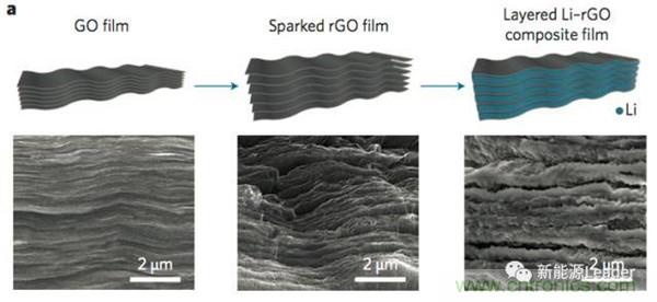 金屬鋰的另一大問(wèn)題就是體積變化大,導(dǎo)致界面波動(dòng)大,容易破壞界面結(jié)構(gòu),目前比較好的解決辦法主要有氧化石墨烯載體(如下圖所示),誘導(dǎo)沉積等方法,利用載體內(nèi)部的空間儲(chǔ)存金屬鋰,從而最大限度的減少在充放電過(guò)程中電極的體積變化「1」。