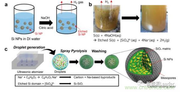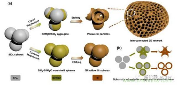 晶體Si的優(yōu)勢(shì)是容量高,首效高,缺點(diǎn)是體積膨脹大,為了克服這一問(wèn)題,工業(yè)上一般是將晶體Si制成納米顆粒,分散在石墨之中,利用石墨吸收Si的體積膨脹。也可以將Si材料制成特殊形狀,例如Si納米線,蜂巢狀Si等。浙江大學(xué)的Hao Wu等「4」利用鎂熱反應(yīng)制成了蜂窩狀的硅材料,如下圖所示,獨(dú)特的蜂窩狀結(jié)構(gòu)能夠很好的吸收Si的體積膨脹,顯著改善了循環(huán)性能,循環(huán)800次容量仍然可達(dá)1058mAh/g,容量保持率為91%。