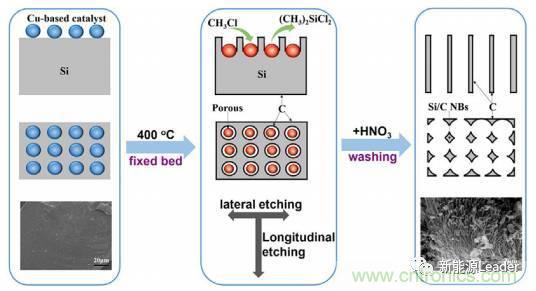 將Si材料與石墨復(fù)合也是克服Si體積膨脹的重要途徑,也是目前唯一上也化運(yùn)用的方法。來(lái)自中科院過(guò)程所的Wenfeng Ren等[5]提出了一中新型的Si-C樹(shù)枝狀復(fù)合結(jié)構(gòu),如下圖所示。該方法首先在工業(yè)級(jí)多晶硅的表面分散一層銅基催化劑,然后在CH3Cl氣氛下,利用該催化劑對(duì)Si基體進(jìn)行腐蝕,最終獲得樹(shù)枝狀的Si材料,這些Si晶體之間的空隙能夠很好的吸收體積膨脹,同時(shí)CH3Cl分解后會(huì)在Si表面形成一層無(wú)定形碳對(duì)Si形成保護(hù),該材料在50mA/g的電流密度下,比容量可以達(dá)到849mAh/g,并具有良好的循環(huán)性能。