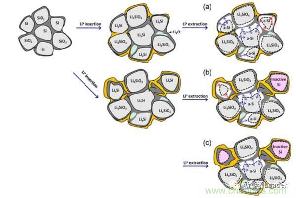 同樣來(lái)自韓國(guó)的Insoo Choi等[7]還對(duì)SiOX失效機(jī)理進(jìn)行了分析,實(shí)驗(yàn)中Insoo Choi發(fā)現(xiàn),Si/SiOX/C復(fù)合電極的失效模式分為兩類,一類是局部實(shí)效,一類是全面實(shí)效。局部失效主要是在充放電過(guò)程中Si/SiOX反復(fù)膨脹,SEI膜變厚,導(dǎo)致活性物質(zhì)顆粒與導(dǎo)電網(wǎng)絡(luò)失去連接,部分嵌鋰的Si顆粒不再參與到充放電反應(yīng)之中,導(dǎo)致電池容量的衰降。全局失效模式主要是因?yàn)檎辰Y(jié)劑失效等原因,導(dǎo)致負(fù)極粉化掉料,引起活性物質(zhì)損失。