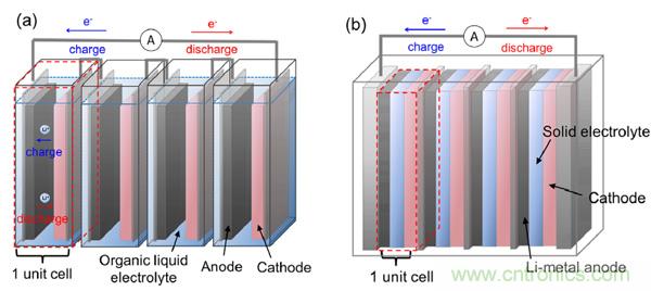 下圖對比了傳統(tǒng)鋰離子電池(a圖)和雙極性鋰電池(b圖,這里是以金屬鋰和全固態(tài)為例)。a圖中,每個電池單元unit cell包括了正極(一般涂覆在Al基材)、負極(一般涂覆在Cu基材);b圖中,每個電池單元unit cell同樣包括了正極、負極,但是正極、負極活性材料共用一個基材:當兩個電池單元串聯(lián)起來時,雙極性電極的一側(cè)在當前單元電池作為負極,另一側(cè)在相鄰單元電池中是作為正極。