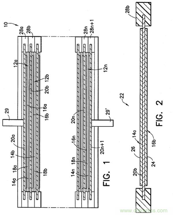 涂層表面上的電流和電勢達到更加均勻的分布,因此,采用雙極性cell構(gòu)成的電池具有更高的功率特性。下圖Fig1是一個典型的由多個雙極性電池單元構(gòu)成的雙極性鋰離子電池截面圖,F(xiàn)ig2是提取出來的其中一個雙極性電池單元。其中,12a、12b,…,12n是電池單元;14a、14b,…,14n是電池單元的正極側(cè);16a、16b,…,16n是電池單元的負極側(cè);18a、18b,…,18n隔膜;20b、20c,…,20n是集流體(例如,F(xiàn)ig2中的14a和16b共用一個集流體),集流體可采用雙金屬基材,例如,Cu-Al雙金屬,負極活性物質(zhì)涂敷在Cu側(cè),正極活性物質(zhì)涂敷在Al側(cè);24是負極活性物質(zhì),26是正極活性物質(zhì);28a、28b,…,28n是絕緣性連接固定結(jié)構(gòu),每個雙極性電極通過該連接結(jié)構(gòu)固定起來。在Fig1和Fig2中,一共有n-1個雙極性電極(集流體兩側(cè)分別有正極、負極活性物質(zhì)),最上層20a只有負極一側(cè),另一側(cè)跟負極極柱29相連,最下層20n+1只有正極一側(cè),另一側(cè)跟正極極柱29相連。