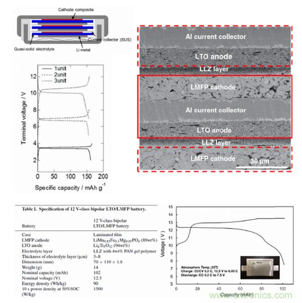 下圖是含有三個雙極性電極的CR2032鈕扣電池。正極是LFP,負極是金屬鋰,采用準固態(tài)聚合物電解質(zhì)和不銹鋼集流體。從電壓曲線可以看到,只要改變雙極性電極的unit數(shù)量,就能改變電池的電壓,這里給的分別是1unit、2units、3units的電壓曲線。例如,很容易通過5個雙極性的unit實現(xiàn)一個12V的鋰離子電池,下圖右側(cè)是日本東芝公司的一個12V雙極性電池的部分截面圖,從表1的參數(shù)中可以看到,這里正極材料是LiMn0.85Fe0.1Mg0.05PO4,負極材料是LTO,集流體是Al,固態(tài)電解質(zhì)電解質(zhì)是Li7La3Zr2O12(LLZ)和PAN。從封裝方式來看,疊片式軟包裝是比較適合雙極性電池的一種方式。