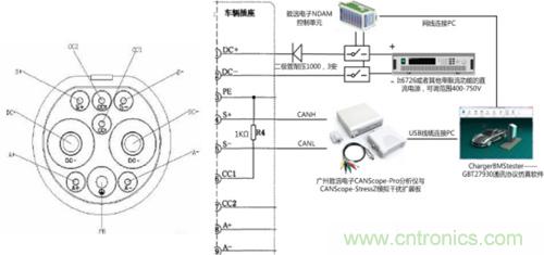 · K5、K6控制單元:驅(qū)動上述繼電器,與協(xié)議模擬器配合,在充電過程進入充電配置階段時實現(xiàn)繼電器吸合,進而使充電樁檢測到模擬電池電壓。本文推薦選擇致遠電子的NDAM-9000與NDAM-2808組成的控制單元,可以通過網(wǎng)口與CANScope實現(xiàn)聯(lián)動。