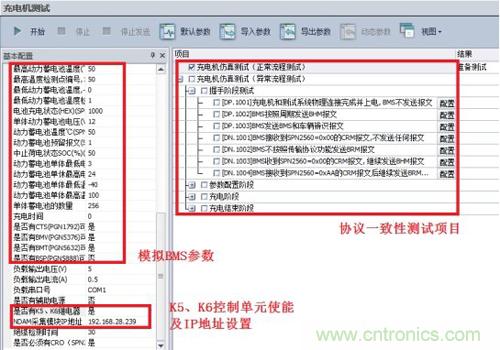 · 啟動CANScope對應(yīng)的充電樁協(xié)議一致性測試軟件ChargerBMS_Tester,選擇BMS仿真測試,配置相應(yīng)信息主要包括模擬的BMS參數(shù)、K5、K6控制單元使能及IP地址設(shè)置。
