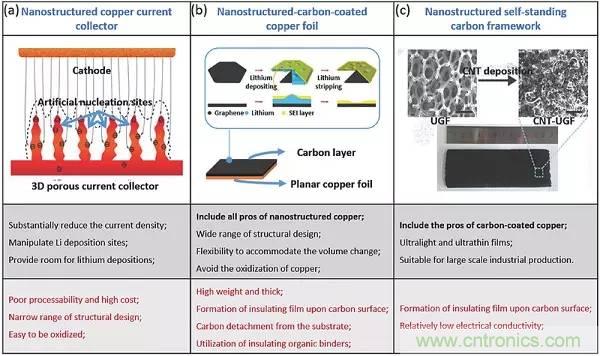 鋰粉末和表面改性的鋰箔可以作為平面鋰箔的替代物,以延遲枝晶的產(chǎn)生。負(fù)極的表面積大大增加以提供相當(dāng)大的沉積位置,從而在一段時(shí)間內(nèi)抑制枝晶生長。然而,鋰箔的表面狀態(tài)和粉末之間的邊界不會持續(xù)很長時(shí)間,并且整個(gè)箔在長時(shí)間循環(huán)中會變成隨機(jī)分散的鋰微結(jié)構(gòu)的聚集體。相比之下,集流體(CCs)方法取得了較好的表現(xiàn),傳統(tǒng)銅箔被納米結(jié)構(gòu)化的材料代替。之后為了避免納米結(jié)構(gòu)銅的缺點(diǎn),開發(fā)了碳涂覆的銅箔,這些碳涂層都貢獻(xiàn)了更好的電化學(xué)性能,這與其優(yōu)異的導(dǎo)電性、高比表面積和合適的孔徑/體積比具有密切的關(guān)系。與納米結(jié)構(gòu)或碳涂層銅箔相比,自支撐碳膜本身可直接作為CCs,能夠避免有機(jī)粘合劑或碳脫落產(chǎn)生的導(dǎo)電性所帶來的不利影響。