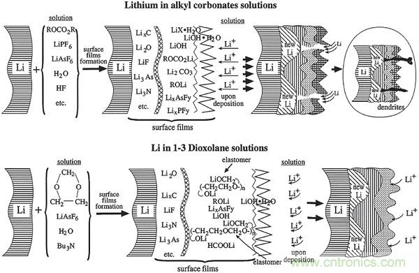 通常,本征SEI層由各種有機(jī)物(低聚物和聚合物)和無機(jī)物組成,其中有機(jī)部分賦予SEI層柔性以適應(yīng)鋰沉積,而無機(jī)部分能夠?qū)崿F(xiàn)快速的鋰離子傳輸。然而,無機(jī)碳酸鋰(Li2CO3)和鋰乙烯碳酸氫鈉(LEDC)作為兩個(gè)主要的SEI組分,在鋰沉積電位附近是熱力學(xué)不穩(wěn)定的,并且允許循環(huán)中反應(yīng)發(fā)生,而氧化鋰(Li2O)是唯一的熱力學(xué)和動(dòng)力學(xué)穩(wěn)定的組分,最里面的SEI層中的Li2O薄層是非常重要的,以避免在沒有氟化物源的情況下破裂。此外,化學(xué)和物理各向異性在SEI層內(nèi)是常見的,同時(shí)導(dǎo)致異質(zhì)鋰通量和不均勻沉積。沉積和溶解時(shí),由無機(jī)離子香料組成的表面不能適應(yīng)形態(tài)變化,因此可能會分解,導(dǎo)致高度不均勻的鋰沉積,使得枝晶形成。迄今為止,選擇合適的溶劑、鋰鹽和添加劑可以有效和高效地調(diào)節(jié)SEI層的性質(zhì)。