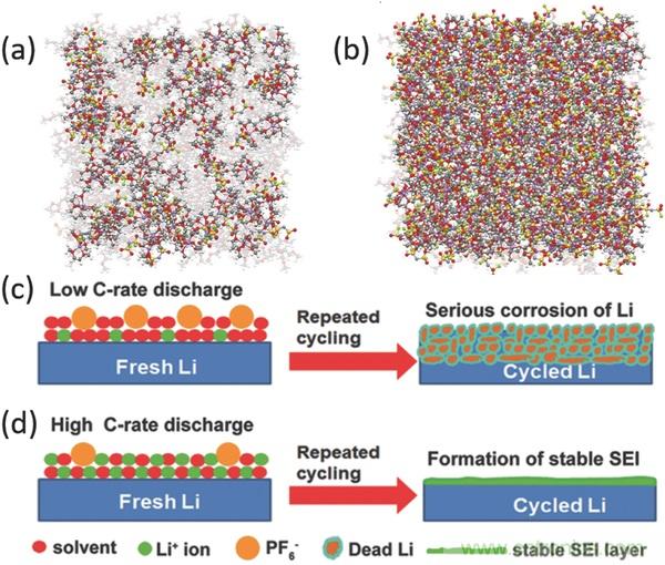 c-d)低速率高速率放電時(shí),鋰金屬負(fù)極上的SEI演變。