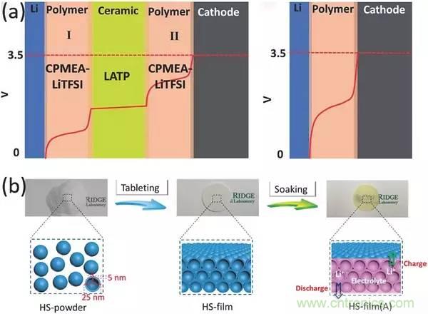 a)聚合物/陶瓷/聚合物-三明治電解質(zhì)(左),內(nèi)部曲線是固體混合電解質(zhì)和單個(gè)固體聚合物電解質(zhì)的電勢分布圖(右);