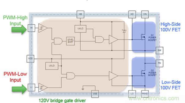 FDMF8811集成了一對100V的功率MOSFET、120 V驅動器IC和一個自舉二極管到6.0 mm x 7.5 mm 的PQFN封裝。