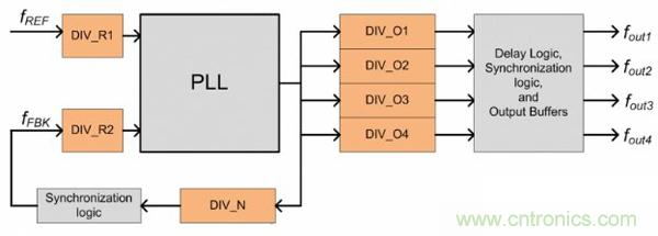 圖 1 為高性能時鐘設備的基本 PLL 架構。該設計使用比例因子為 PLL 輸出端口提供時鐘合成。最終輸出頻率的基本公式為:
