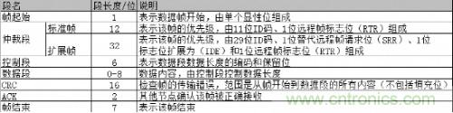 目前使用最廣泛的CAN-bus網絡標準是V2.0版本,該標準又分為A、B兩部分,它們主要的區(qū)別在仲裁區(qū)域的ID碼長度。其中CAN2.0A(標準幀)為11位ID,CAN2.0B(擴展幀)為29位ID。下表1為CAN報文結構: