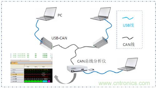下面進入重點,如果兩個節(jié)點ID段相同會怎樣?我們用兩個CAN卡 和一臺CANScope開始實驗,CAN卡模擬CAN標準節(jié)點收發(fā)報文,CANScope做通信監(jiān)控,如圖2所示。(注:CAN卡為USB轉CAN工具,CANScope為CAN總線分析儀,產品詳見ZLG致遠電子官網)