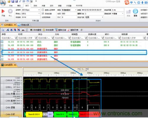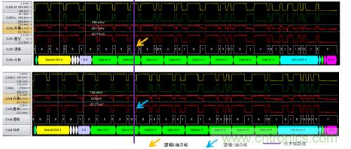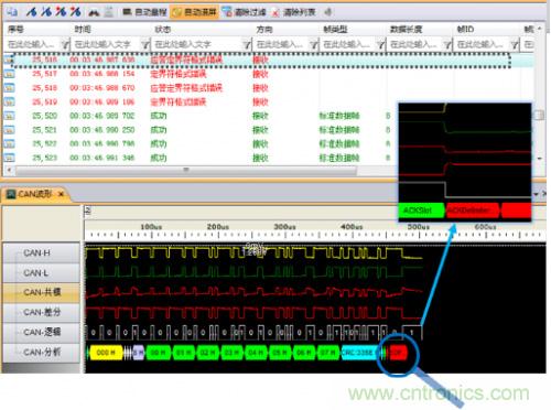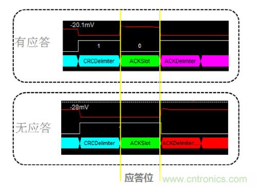 為什么會發(fā)生這種錯誤呢?發(fā)送報文的節(jié)點會在ACK段發(fā)送兩個隱性位,若在第一個位期間接收到顯性電平則認為該幀被正確接收。由于仲裁段相同時兩節(jié)點都認為自己取得仲裁權,在ACK段等待應答,但該網絡中僅存在兩個節(jié)點,因此在ACK段不能收到應答,進而發(fā)生應答定界符錯誤。簡單說來這種情形就類似于總線中只有一個節(jié)點將不能實現(xiàn)數據發(fā)送。圖7是在ACK段有無應答時的波形對比。