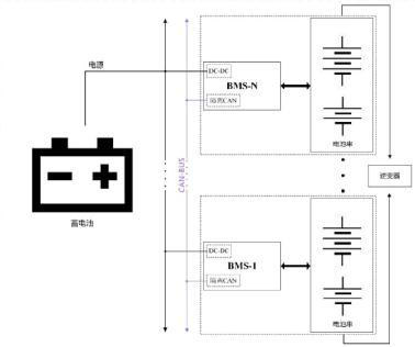 首先,應(yīng)避免BMS模塊之間的相互干擾,電源輸入前端使用隔離DC-DC電源。一臺(tái)車?yán)镉泻芏郆MS模塊,每個(gè)模塊都集中從蓄電池里取電,具體電動(dòng)汽車內(nèi)部框圖如圖3所示。為保證每個(gè)模塊供電不會(huì)相互串?dāng)_,同時(shí)保證BMS單個(gè)模塊的獨(dú)立性,因此需要在BMS的電源輸入前端使用隔離DC-DC電源,并且輸入電壓范圍應(yīng)較寬。