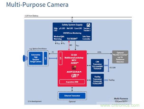 Visiconti采用多核異構的專用處理器,Visconti2可實時處理,并行實現4項功能,如車道保持、前車檢測、行人辨識、交通標志辨識。Visconti4圖像識別處理器可輕松對車輛和行人加以辨識,對交通信號、障礙物、行車線等信息加以識別,從而實現各種高級的駕駛員輔助應用,如入車道偏離警告、前方/后方防撞警告、前方/后方行人防撞警告、交通標識識別等,能同時處理并實現8項功能。