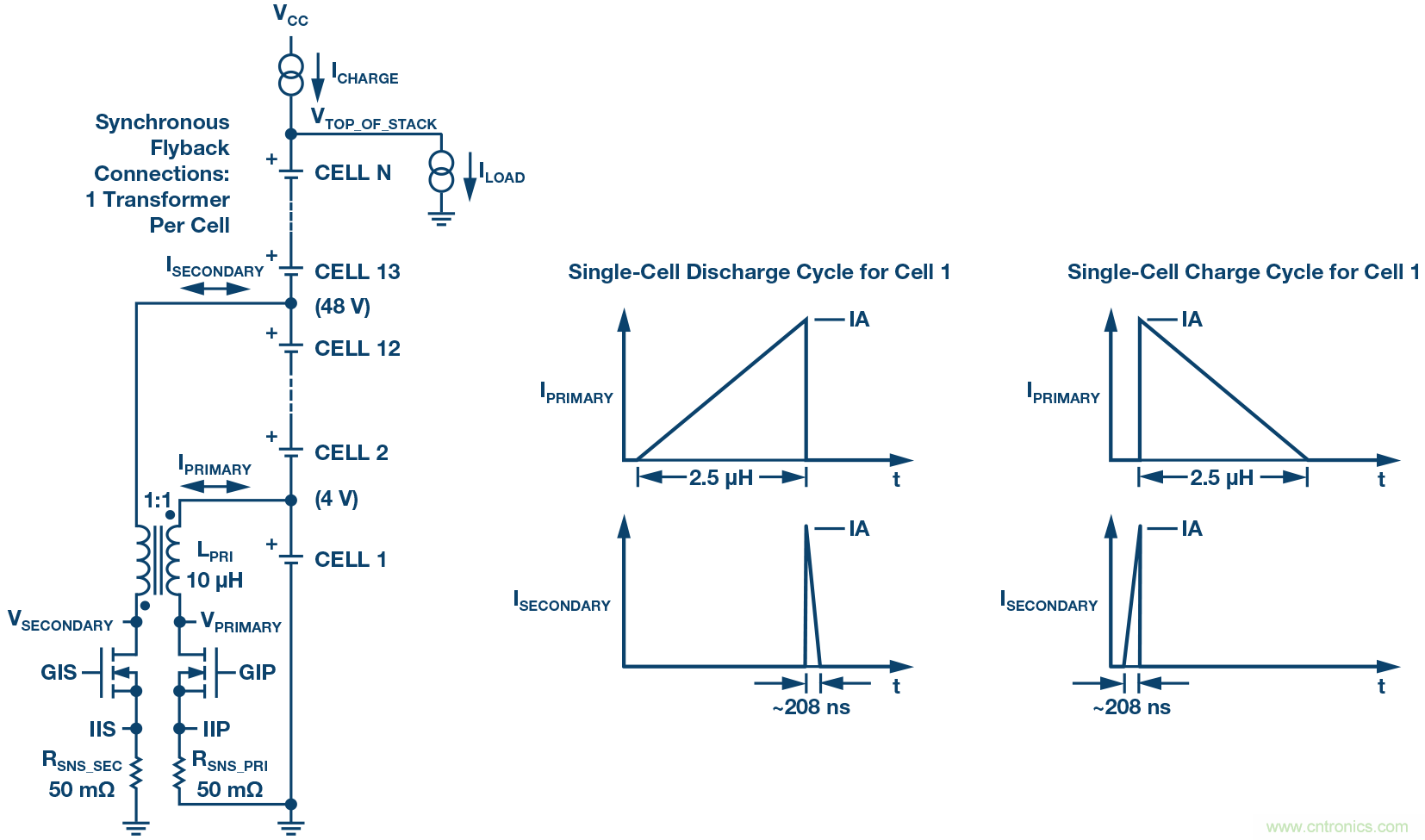 圖4. LTC3300-2高效率、雙向、多電池單元主動均衡器。