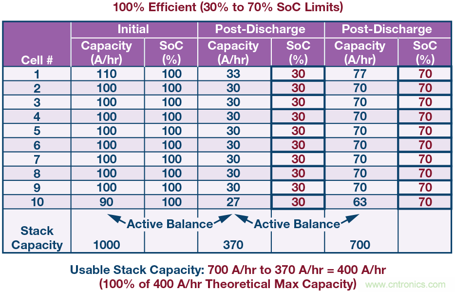 電池單元間的容量或SoC不匹配可能會嚴重降低電池包可用容量,除非均衡電池單元。為使電池包容量最大化,要求在電池包充電和放電期間,電池單元是均衡的。在圖2所示的例子中,一個10單元串聯(lián)電池包由(標稱)100 安時電池單元組成,最小容量單元與最大容量單元的容量誤差為±10%,對該電池包充電和放電,直至達到預(yù)定SoC限值。如果SoC值限制在30%和70%之間,并且不進行均衡,則經(jīng)過一次完全充電/放電循環(huán)之后,電池包可用容量相對于理論可用容量減少25%。被動均衡理論上可以在電池包充電階段均衡各電池單元的SoC,但在放電期間,無法阻止第10個單元先于其他單元達到30%的SoC水平。即使在電池包充電期間進行被動均衡,在電池包放電期間也會損失可觀的容量(不可用)。只有主動均衡解決方案才能恢復(fù)容量,在電池包放電期間將電荷從高SoC單元重新分配給低SoC單元。