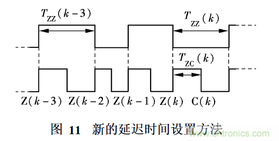 為使換相點(diǎn)位于相鄰2個(gè)過(guò)零點(diǎn)的中間位置,本文提出一種新的延遲時(shí)間設(shè)置方法. 如圖11所示,過(guò)零點(diǎn)的間隔時(shí)間TZZ ( k - 3)和TZZ ( k)相等,當(dāng)檢測(cè)到第k次過(guò)零點(diǎn)時(shí),從第k次過(guò)零點(diǎn)到第k次換相點(diǎn)的延遲時(shí)間tZC ( k)如下設(shè)置: