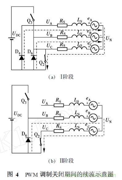 AC 和AB 區(qū)為A 相上橋臂開(kāi)關(guān)PWM 調(diào)制階段. 以AC區(qū)為例,在PWM 開(kāi)通期間, Q1 和Q2 導(dǎo)通, A 相繞組與直流側(cè)電壓的正極相連, 端電壓為UDC ;在PWM 關(guān)閉期間, Q1 關(guān)閉, Q2 導(dǎo)通,由于繞組阻抗呈感性, A 相下橋臂的反并聯(lián)二極管D4 導(dǎo)通續(xù)流,此時(shí)A 相繞組與直流側(cè)電壓的負(fù)極相連,端電壓為零.