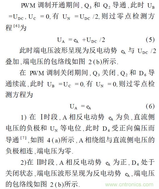 提出了在on _pwm 調(diào)制方式時(shí)的反電動(dòng)勢(shì)過(guò)零點(diǎn)檢測(cè)方法,采用內(nèi)置AD 的微控制器在PWM開(kāi)通時(shí)檢測(cè)懸空相端電壓,軟件算法中使用簡(jiǎn)單的代數(shù)運(yùn)算,獲得準(zhǔn)確的過(guò)零點(diǎn)信號(hào). 目前,關(guān)于反電動(dòng)勢(shì)法的研究多集中在反電動(dòng)勢(shì)過(guò)零點(diǎn)的檢測(cè)電路方法和由濾液電路引起的相位誤差的消除或補(bǔ)償方法,但在準(zhǔn)確換相方面的研究尚不夠深入.