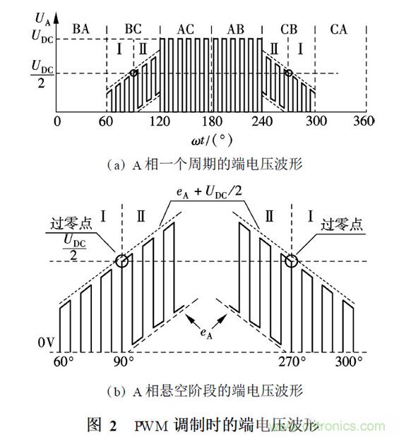無(wú)刷直流電機(jī)控制可以采用多種PWM 調(diào)制方式. 采用的調(diào)制方式不同, 呈現(xiàn)的端電壓波形也不同. 本文采用上橋臂PWM 調(diào)制,下橋臂恒通(H _pwm 2L _on )的調(diào)制方式. 以A 相為例, 假設(shè)PWM 占空比為50% ,忽略高頻開(kāi)關(guān)噪聲和換相續(xù)流產(chǎn)生的脈沖毛刺,理想的端電壓波形如圖2 ( a)所示. 在一個(gè)周期范圍內(nèi),將A 相端電壓波形劃分為BA, BC, AC, AB, CB 和CA 六個(gè)區(qū)域,每個(gè)區(qū)域?qū)?yīng)一個(gè)工作狀態(tài). 端電壓波形的上升部分和下降部分為BC區(qū)和CB 區(qū),此時(shí)A 相處于懸空狀態(tài).