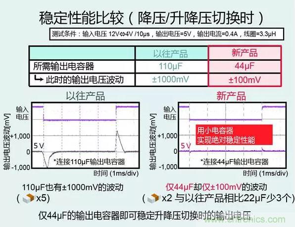 該升降壓電源,可實現業界最優異的無負載時消耗電流8µA,并以44µF輸出電容容量實現輸出電壓波動僅±100mV的穩定工作(消耗電流比普通產品低70%,輸出電容容量減少50%),因此非常有助于配備怠速啟停功能的車輛等在短時間內輸入電壓發生顯著下降的應用實現穩定工作以及進一步節能。
