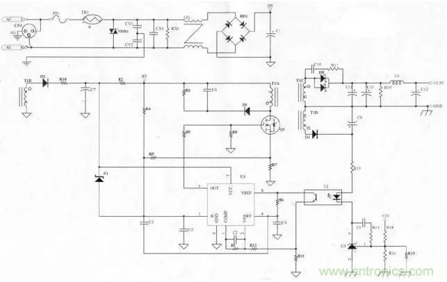 【導讀】以下是高手分享電源原理圖及每個元件的功能詳解。首先,變壓器是整個電源供應器的重要核心,所以變壓器的計算及驗證是很重要的。濾波電容的決定,可以決定電容器上的Vin(min),濾波電容越大,Vin(win)越高,可以做較大瓦數的Power,但相對價格亦較高。