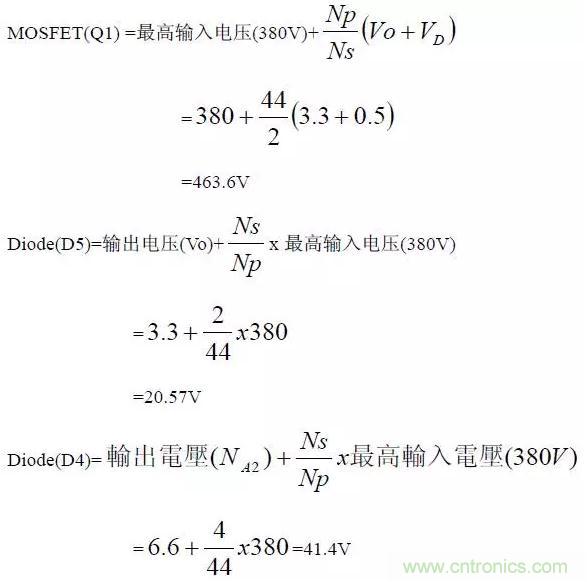 依據變壓器的圈比關系,可以初步計算出變壓器的應力(Stress)是否符合選用零件的規格,計算時以輸入電壓264V(電容器上為380V)為基準。