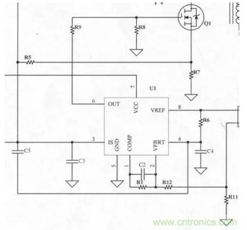 3843內部有一個Error AMP(誤差放大器),R1、R11、R12、C2及Error AMP組成一個負回授電路,用來調整回路增益的穩定度,回路增益,調整不恰當可能會造成振蕩或輸出電壓不正確,一般C2使用立式積層電容(溫度持性較好)。