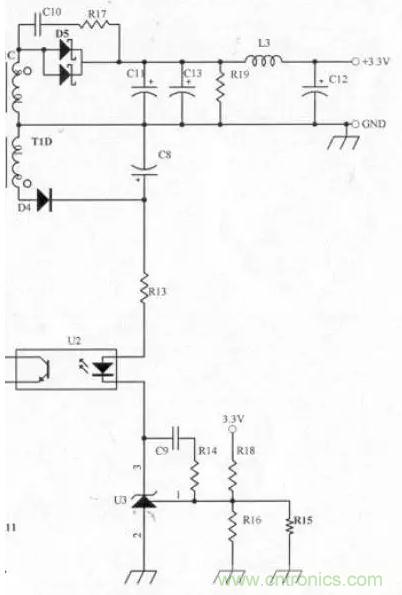 主要用于調整PWM IC的VCC電壓,以目前使用的3843而言,設計時VCC必須大于8.4V(Min. Load時),但為考慮輸出短路的情況,VCC電壓不可設計的太高,以免當輸出短路時不保護(或輸入瓦數過大)。
