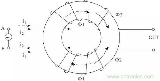 如圖所示,在同一磁環上繞上兩組方向相反的線圈,據右手螺旋管定則可知,當在輸入端A、B兩端加上極性相反,信號幅值相同的差模電壓時,有實線所示的電流i2,在磁芯中產生實線所示的磁通Φ2,只要保證兩繞組完全對稱,則磁芯中兩不同方向之磁通相互抵消??偞磐榱?,線圈電感幾乎為零,對常模信號無阻抗作用。若在輸入端A、B兩端加上極性相同,幅值相等的共模信號時,有虛線所示的電流i1,在磁芯中產生虛線所示的磁通Φ1,則磁芯中磁通有相同的方向而互相加強,使每一線圈的電感值為單獨存在時的兩倍,而XL =ωL,因此,此一繞法的線圈對共模干擾有很強的抑制作用。