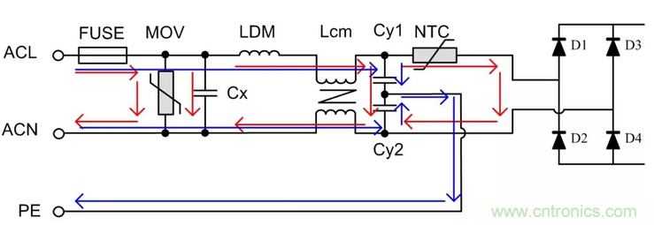 對(duì)ACL與ACN之間施加的浪涌電壓稱為差模浪涌電壓,差模路徑如圖中紅線所示;對(duì)ACL(或ACN)與PE之間施加的電壓稱為共模浪涌電壓,共模路徑如圖中藍(lán)線所示。