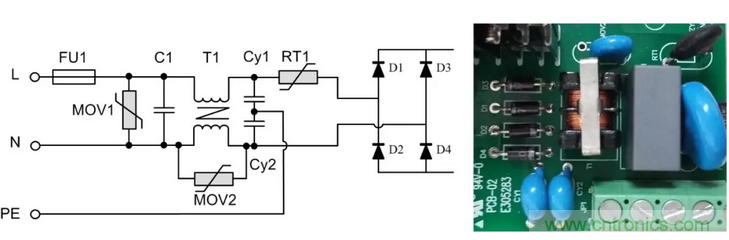 背景:以某型號(hào)的電源模塊為例,該模塊是ZLG致遠(yuǎn)電子為某客戶定制的電源模塊,輸入85VAC~350VAC,且EMC前級(jí)電路電路嵌入到模塊中。抗浪涌要求差模電壓3KV,共模電壓6KV。更換更大的保險(xiǎn)絲后可承受6KV差模電壓。其前級(jí)原理圖及對(duì)應(yīng)實(shí)物圖如圖2所示。