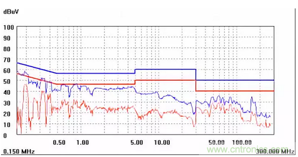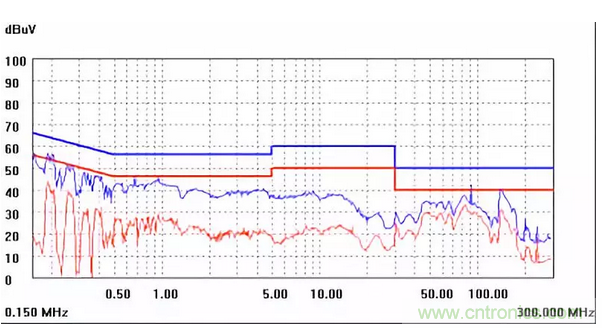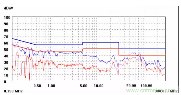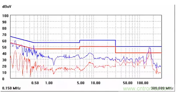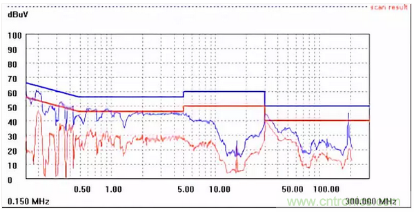 圖一a可以看出,改變PCB布局后130M-200M已經完全被衰減,但是30-130M沒有圖一效果好,可能變壓器出線無交叉好一些。仔細觀察,此IC具有抖頻功能,傳導部分頻段削掉了一些尖峰;